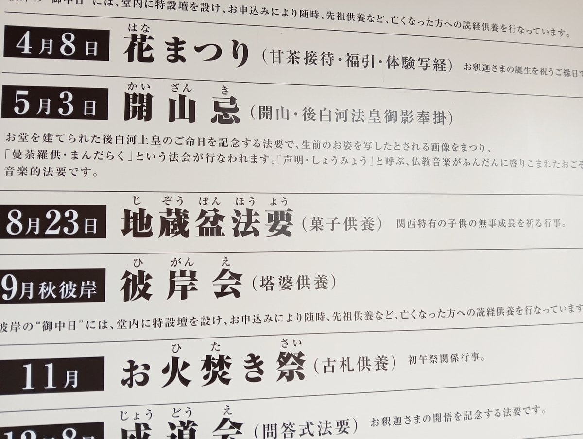 入ると直ぐ後ろを振り返り、蓮華王院の年間仏事と行事が事細か案内写真やパネルで案内されて居る。